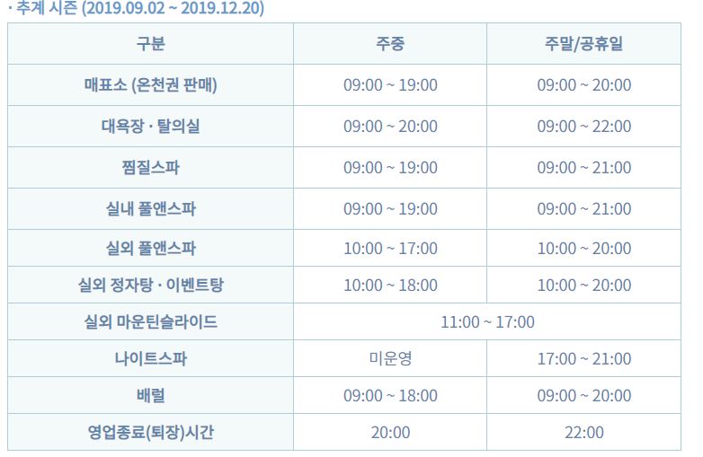 · 키즈존, 마운틴 슬라이드, 슬라이드, 실외 이벤트탕, 대욕장 노천탕 운영시간은 탄력적으로 운영됩니다.