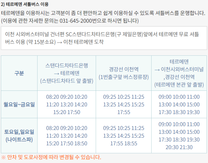 이천 테르메덴 무료 셔틀버스 시간표는 아래와 같으니 시간 참고하셔서 편안히 오시면 될 것 같아요.