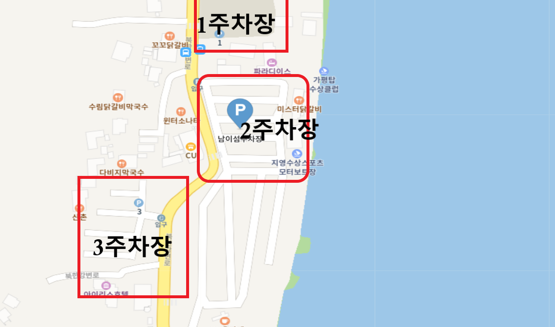 1 주차장같은 경우 다른 주차장보다는 복잡하지 않지만 남이섬 선착장까지 거리가 있어서 좀 걸어야 돼요.